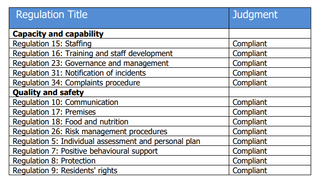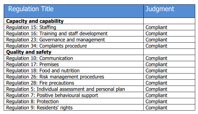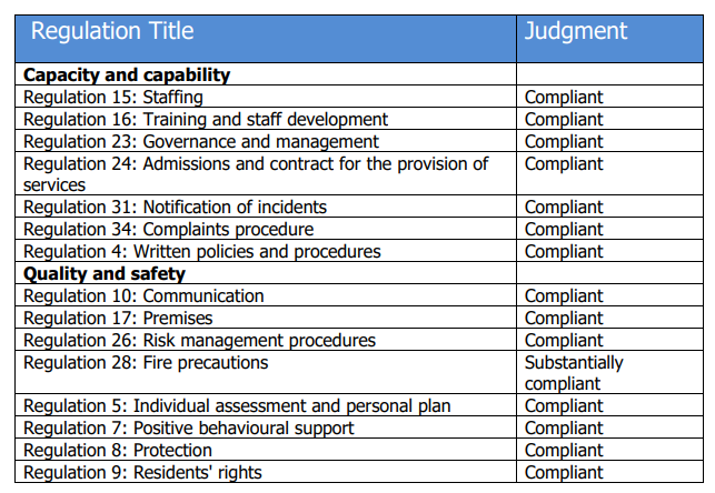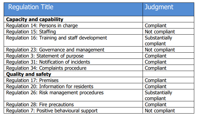 They were in the areas of Staffing, Governance and Management and Positive Behavioural Support.