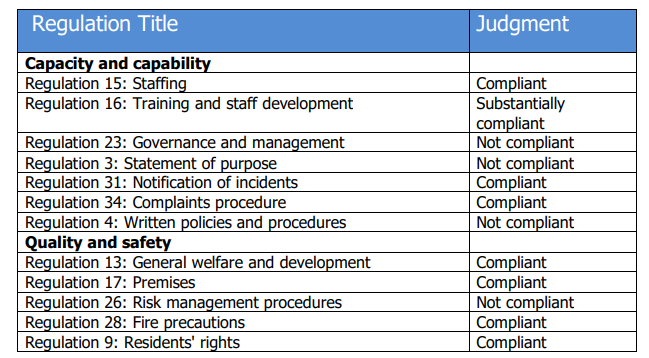 The outcome of the inspection was that of the twelve regulations inspected, seven regulations received a compliant judgement, one regulation received a substantially compliant judgement and four were deemed to be not compliant.