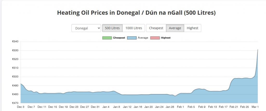 In Donegal, the average price of 500L has risen by almost €30 overnight.