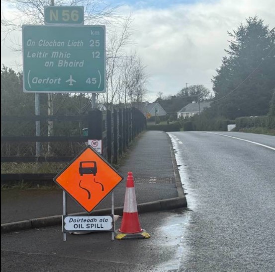 Motorists are warned of an oil spill on the N56 in the Glenties area, which may cause slippery conditions.