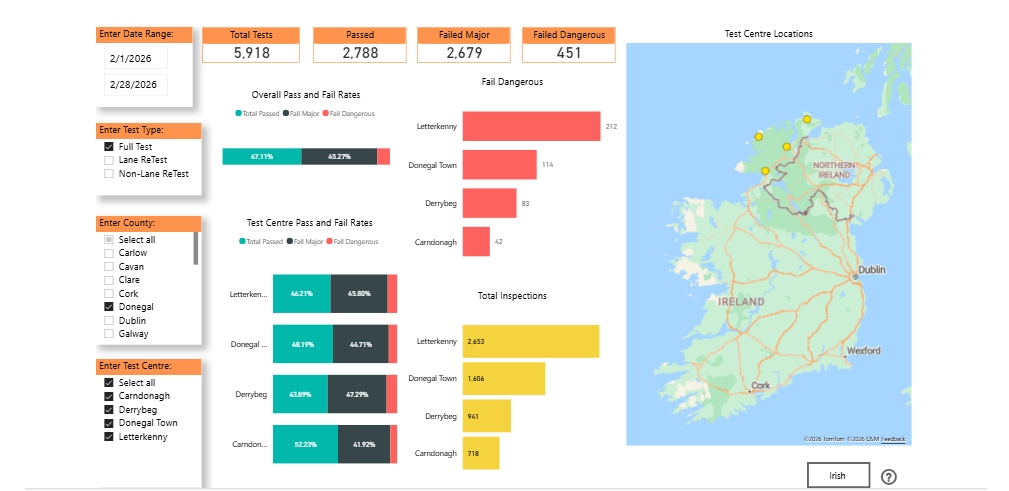 Letterkenny was the busiest test centre, carrying out 2,653 inspections, where 212 failed dangerously.