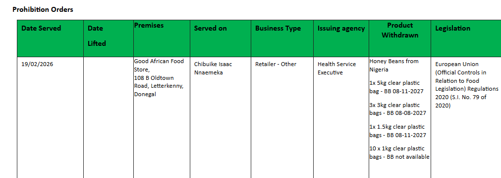 Meanwhile, on February 19th, a prohibition order was served on the Good African Food Store on Oldtown Road in Letterkenny, preventing it from selling a batch of Honey Beans from Nigeria because they were displayed for sale without adequate labelling or identification to facilitate its traceability.