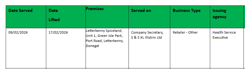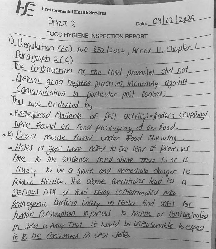 A closure order was served on Letterkenny Spiceland on February 9th after a number of breaches were detected. They included rodent droppings on food packaging, and a dead mouse under a shelving unit.