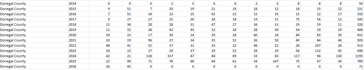 Commencement notices were issued for 45 homes in Donegal last month, all of them one off housing units.