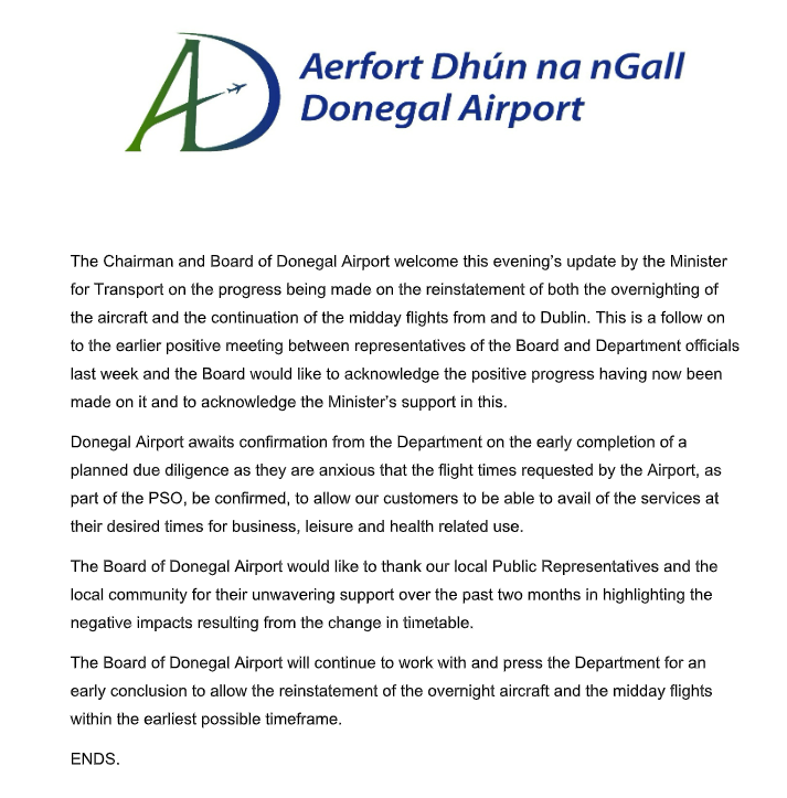 The Board of Donegal Airport says it will continue to work with and press the Department of Transport for an early conclusion to allow the reinstatement of the overnight aircraft and the midday flights between Dublin and Donegal within the earliest possible timeframe.