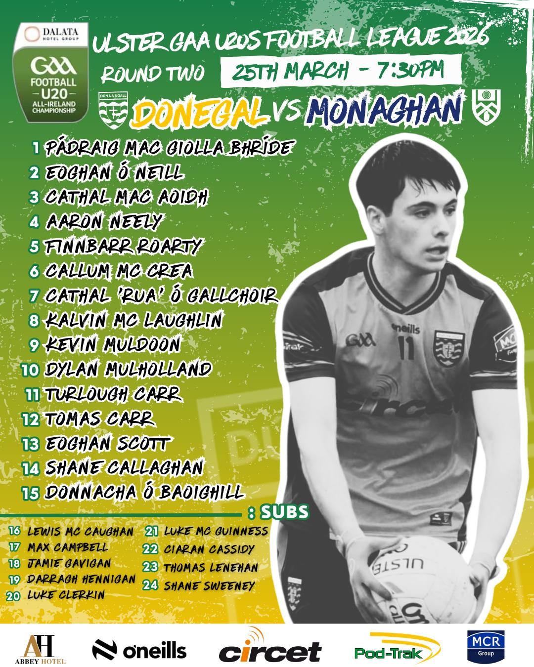 Donegal have named their team to face Monaghan in the Ulster U20 Football Championship in Castleblayney this evening.