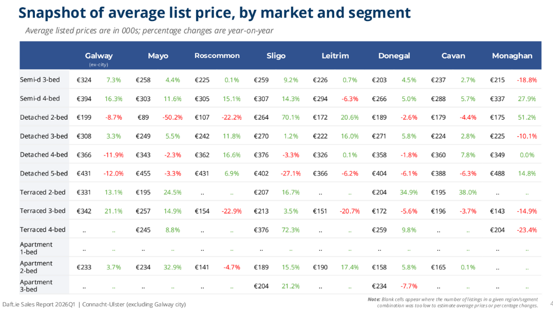 The average price of three-bedroom semi-detached house in the year to March was €252,000 in Connacht-Ulster, excluding Galway city, with list prices on average 8.2% higher than a year previously.