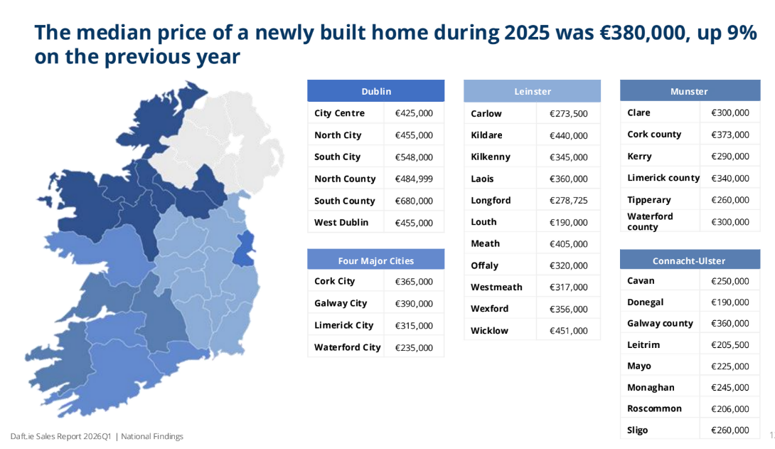 Nationally, the average price of a three-bed semi-detached home in the first quarter of 2026 was €435,000.