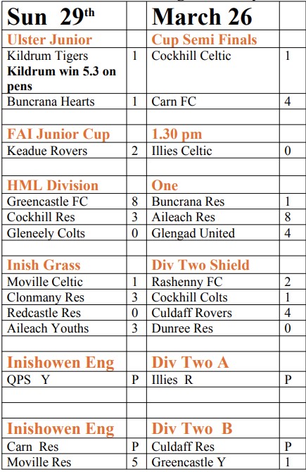 Inishowen Football League Results – Sunday 29/03/26