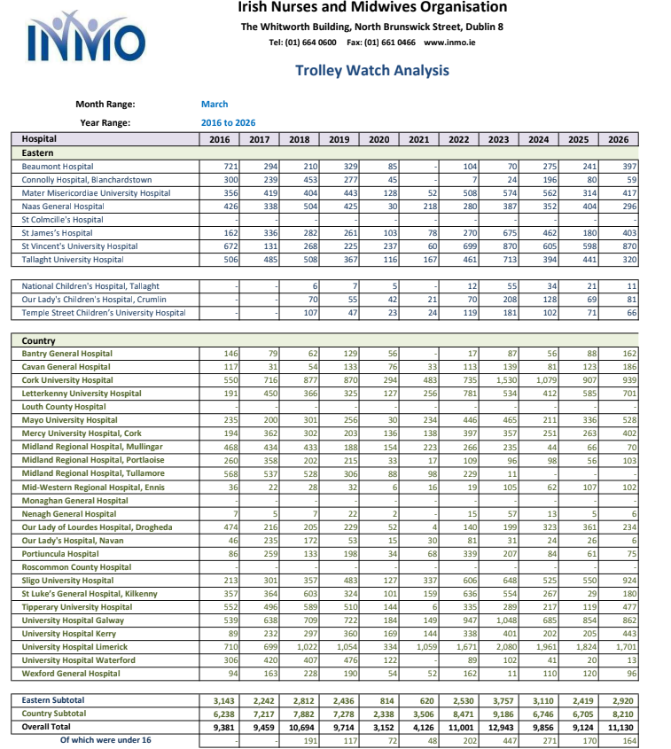 Last month was the second busiest March on record for hospital overcrowding, according to the INMO.