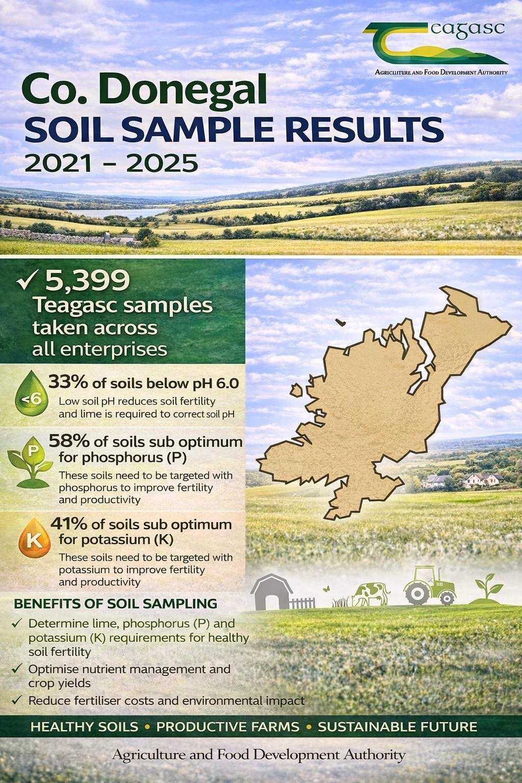 Reviewing soil tests across Donegal from 2022 to 2025, out of 5,399 samples, 64% showed a pH below 6.3.