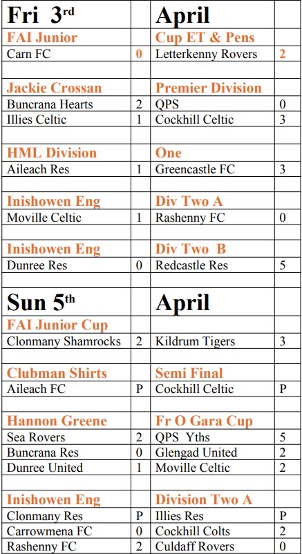 Home / News & Sport / Inishowen Football League Results – Sunday 05/04/26