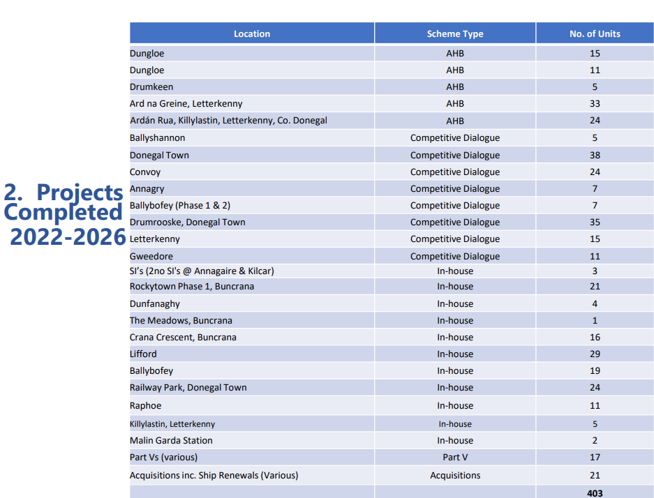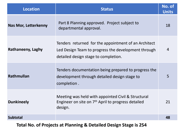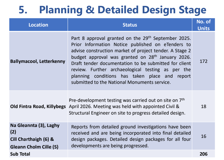 Five developments totalling 189 units are at the final contract stage via the competitive dialogue process, including 38 homes in Muff, 34 in Ballybofey, 62 in Donegal Town, 20 in Ballintra and 35 in Moville.