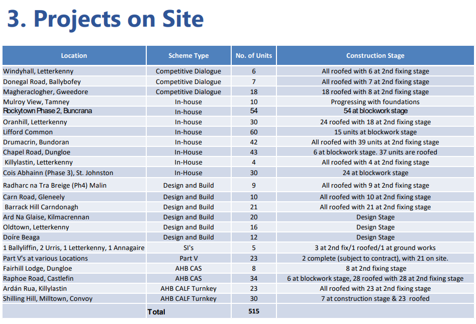 Donegal County Council has been told that since the current social housing programme began in 2022, 403 units have been built or acquired, and a further 515 are currently onsite.