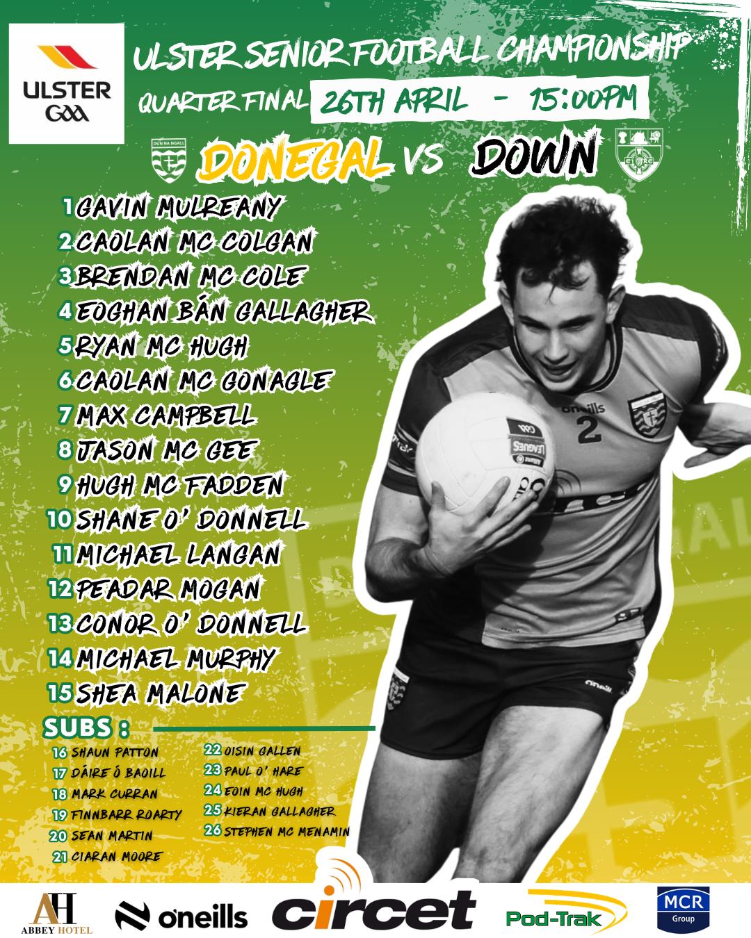 The Donegal panel for Sunday’s Ulster Championship quarter final against Down has been named with the first 15 the same as the side which lined out in the league final win over Kerry.