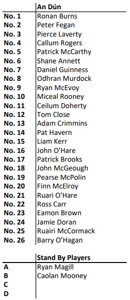In three changes to the team that lined out against Wexford in the Division 3 Final, Patrick McCarthy, Tom Close and Liam Kerr all come into the starting fifteen with Patrick Brooks, John McGeough and Ryan Magill dropping out.