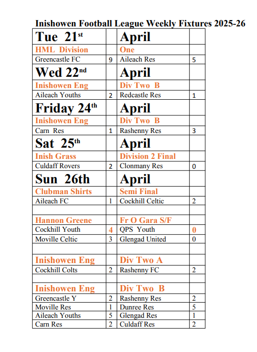 Home / News & Sport / Inishowen Football League Results – Sunday 26/04/26