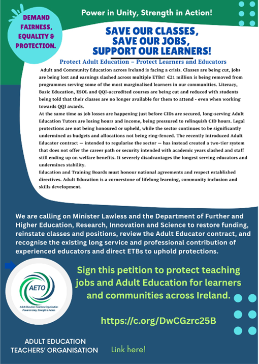 The Adult Education Teachers Organisation says many members face insecure contracts, reduced income during breaks and unequal treatment compared to other education roles.