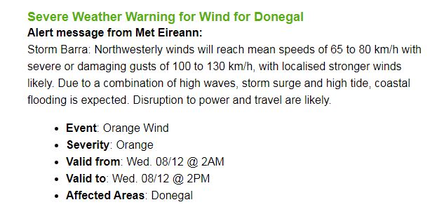 Orange wind warning for Donegal from 2am to 2pm tomorrow