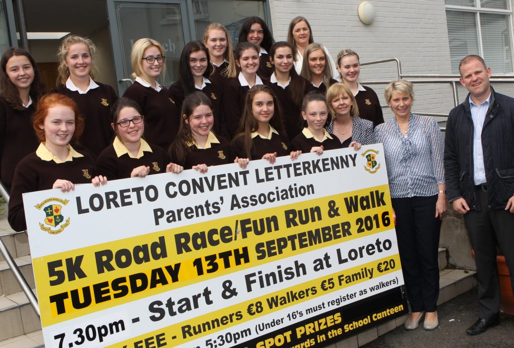 Special guest Manus Kelly Students , Parents committee and Principal, Nora Friel at the launch of the Loreto Secondary School, Letterkenny Annual 5K road Race / Fun Run and Walk which will take place on Tuesday next, 13th September, starting at 7.30pm. This year the event has been included as part of the Athletics Grand