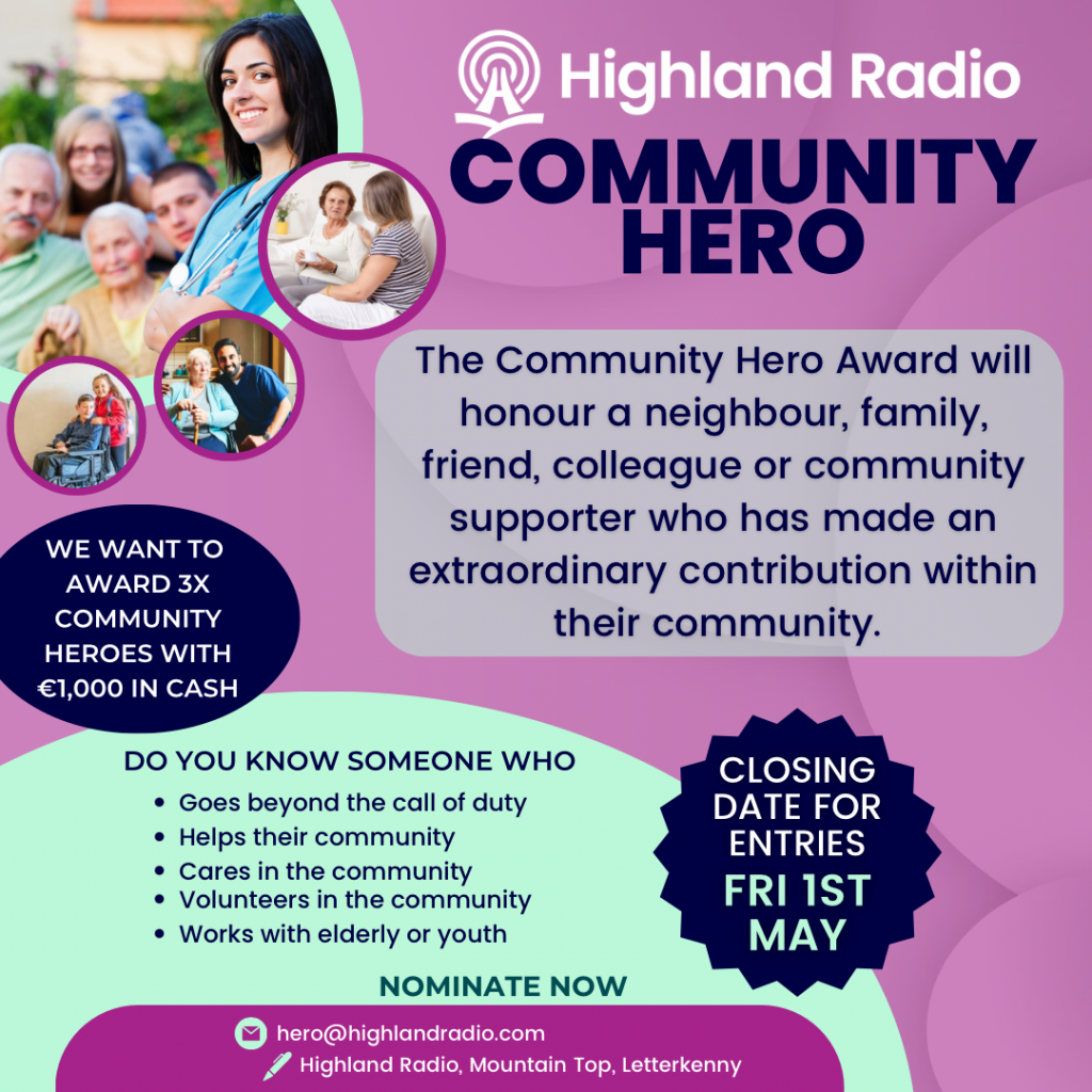 Nominate someone who you believe is a hero in your community by emailing their name, address, the reason why and your contact details to hero@highlandradio.com or post your nomination to Highland Radio, Mountain Top, Letterkenny, Co Donegal.